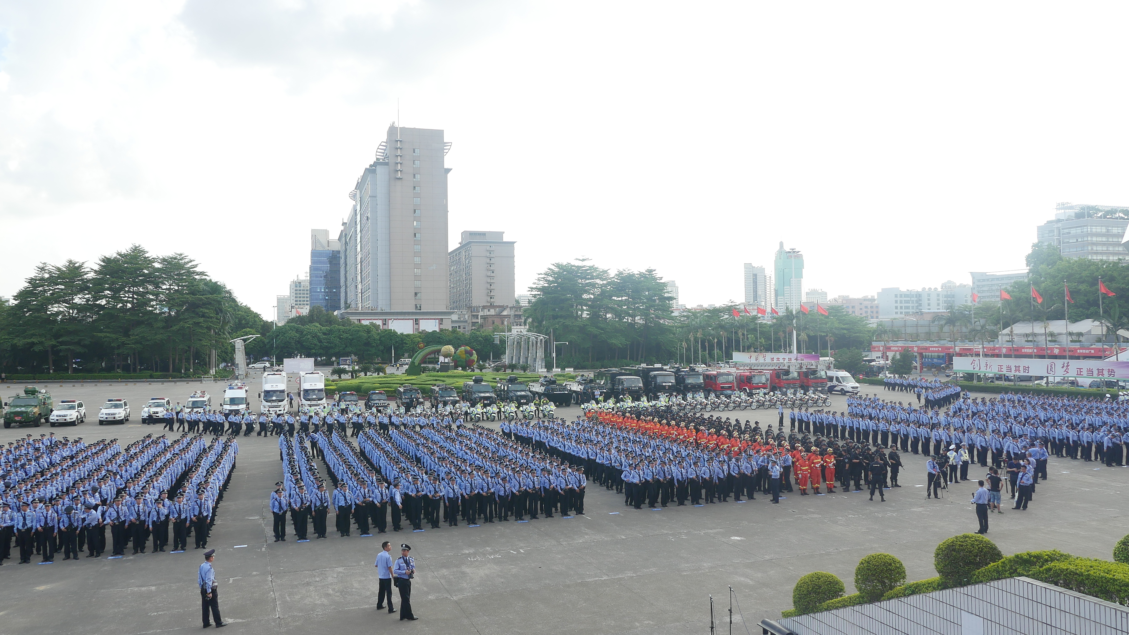 市公安局局直機關領導直機關領導、交警(含鐵騎隊)、特警、邊防、消防、邊檢站、鎮街(園區)公安分局等組成40個方陣2000余民警、無人機編隊、鐵騎隊、特種車輛車隊、警航飛行隊嚴陣待發,場面威武壯觀。
