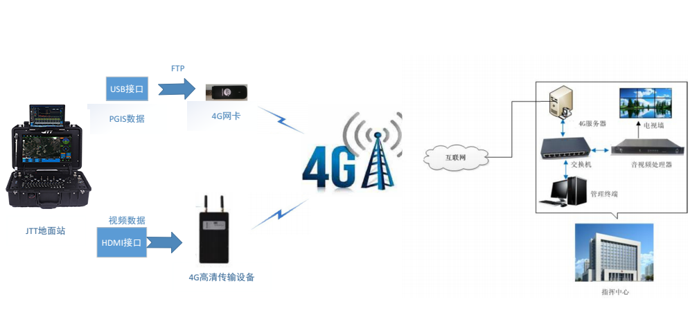 無人機在巡檢時高空拍攝到的圖像和視頻以及無人機的坐標、高程信息通過無線通信鏈路傳輸到地面站后,可通過專用有線網絡與現場的移動前置機形成數據通路,也可借助4G網絡把數據輸入到內網的數據庫中并連通到應急指揮調度平臺。通過這種方式,巡檢現場的第一手資料與龐大的數據庫之間就形成了協同作戰的態勢。無論是領導指揮還是第一線巡檢人員的具體執行都將得到有力、有效和迅速的信息支撐。