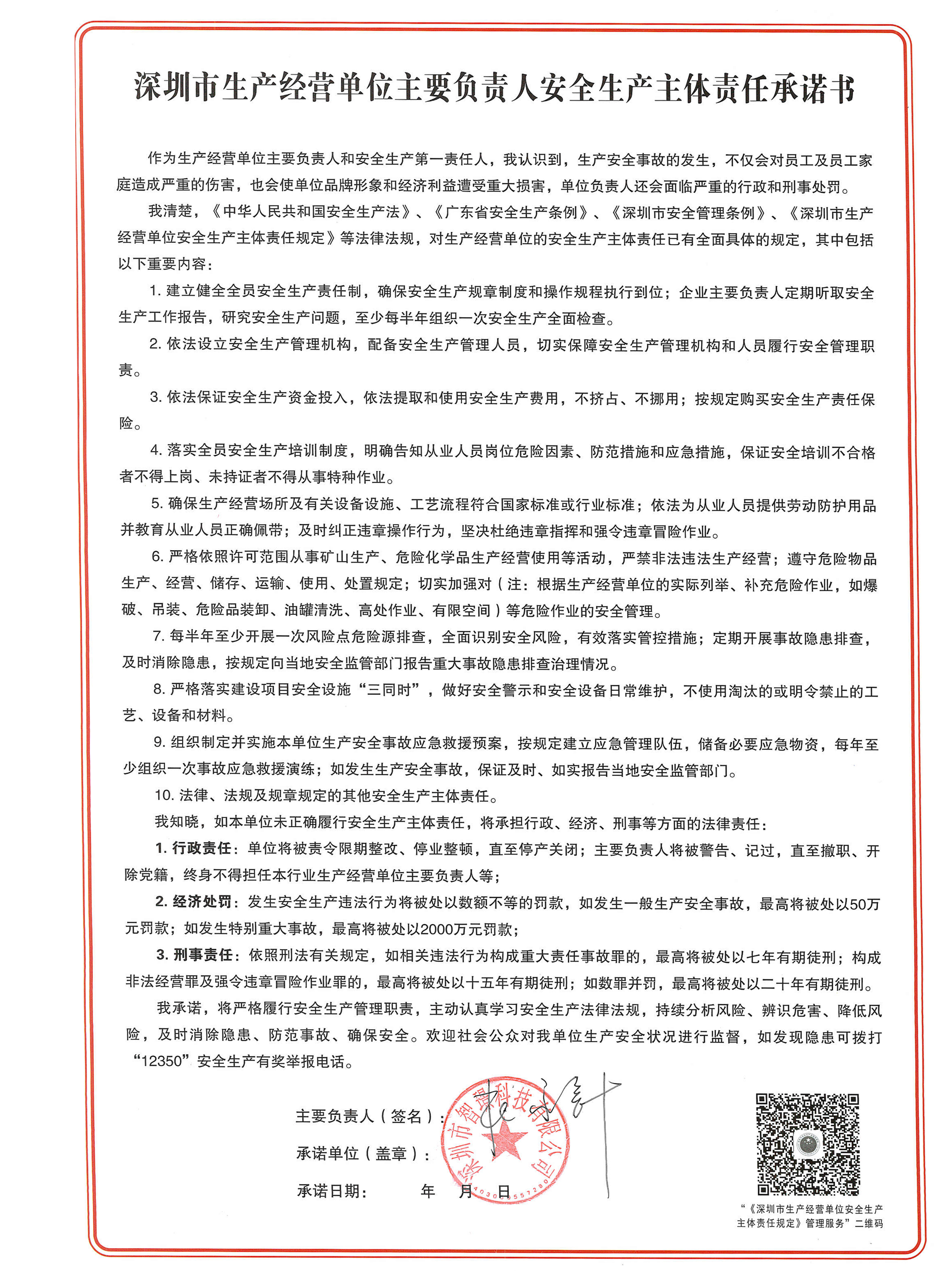 智璟科技簽署《深圳市生產經營單位主要負責人安全生產主體責任承諾書》