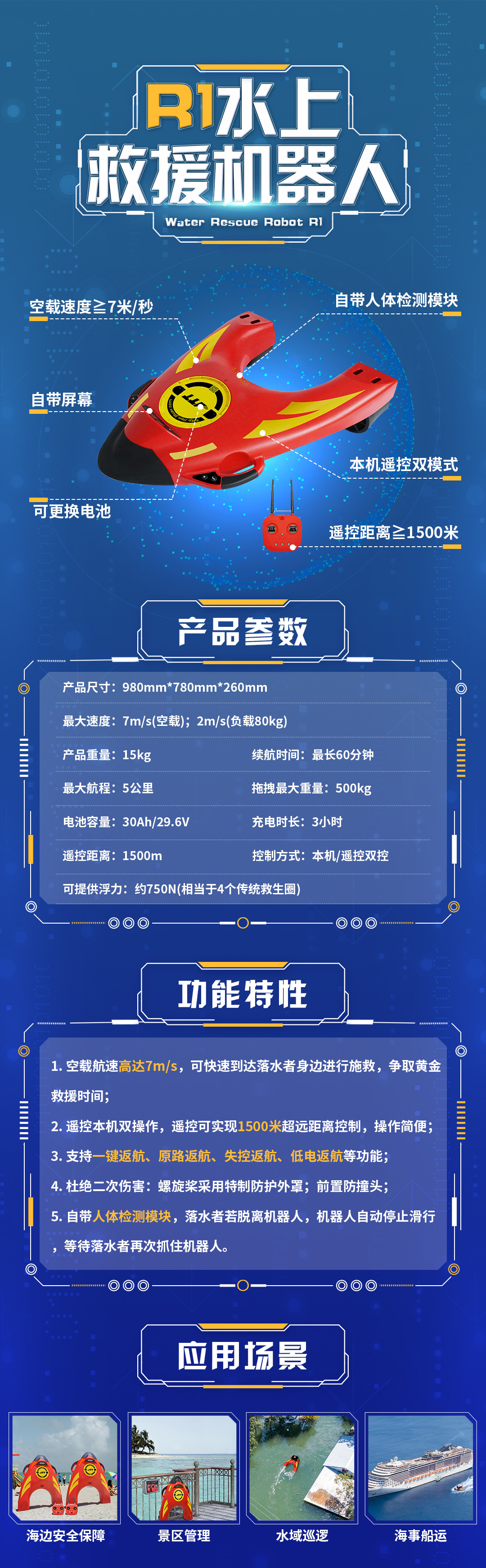 水上救援受地形、外環(huán)境變化的影響,救援難度也不一樣,比如,在寒冷天氣中的溺水救援。救援人員則可以通過拋投水上救援機器人,讓其立即出發(fā),在最短的時間內讓溺水人員抓住機器人,獲得呼吸的機會,并由機器人帶回岸上。又或者,為了應對雨季發(fā)生的洪災,使用水上救援艇,實施大規(guī)模救援,保障生命。