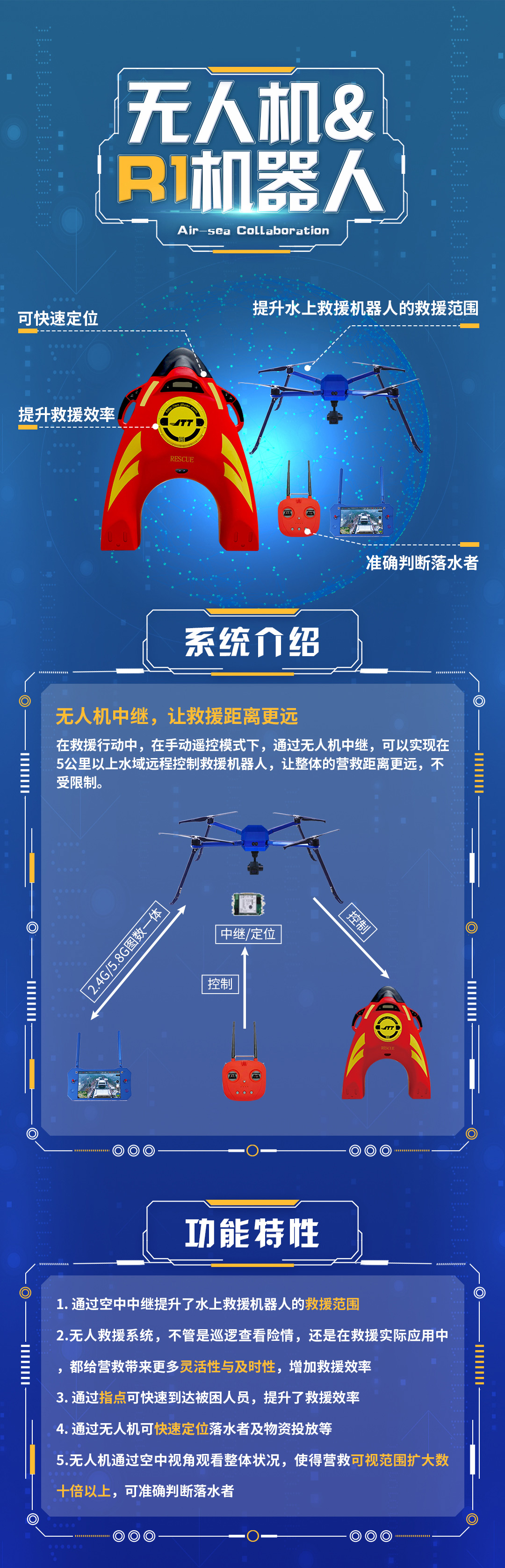 當日,海岸警衛(wèi)隊在附近通過C85無人機進行著空中俯視巡邏,搭配著30倍高清圖傳放大查看海域各個地方的異常點,也搭配著救生包隨時準備救援。警衛(wèi)隊在巡邏時忽然發(fā)現(xiàn)一個地方有異樣,放大看是兩名少年到了深水區(qū)掙扎著,似乎出現(xiàn)了溺水的狀態(tài),附近也剛好沒人,情況危急,但他們距離著警衛(wèi)隊有300m的范圍,那么怎樣同時救起兩個人呢?隨后警衛(wèi)隊出動了R1水上救援機器人,并開啟了中繼空海一體救援模式,R1跟隨無人機方向行駛,同時救援距離增加到了5km超遠距離,不到1分鐘的時間,機器人和無人機就到達了現(xiàn)場,無人機拋投了救生包,救生包展開,一位青年隨即抓住得以呼吸,而另外一位則抓住了R1,兩個人都同時得到了生還的機會。隨后,有救生包者則抓住了另外一個人,一起隨著R1回到了岸上。無人化的救援讓他們在沒有任何人幫助下留下了一線希望。