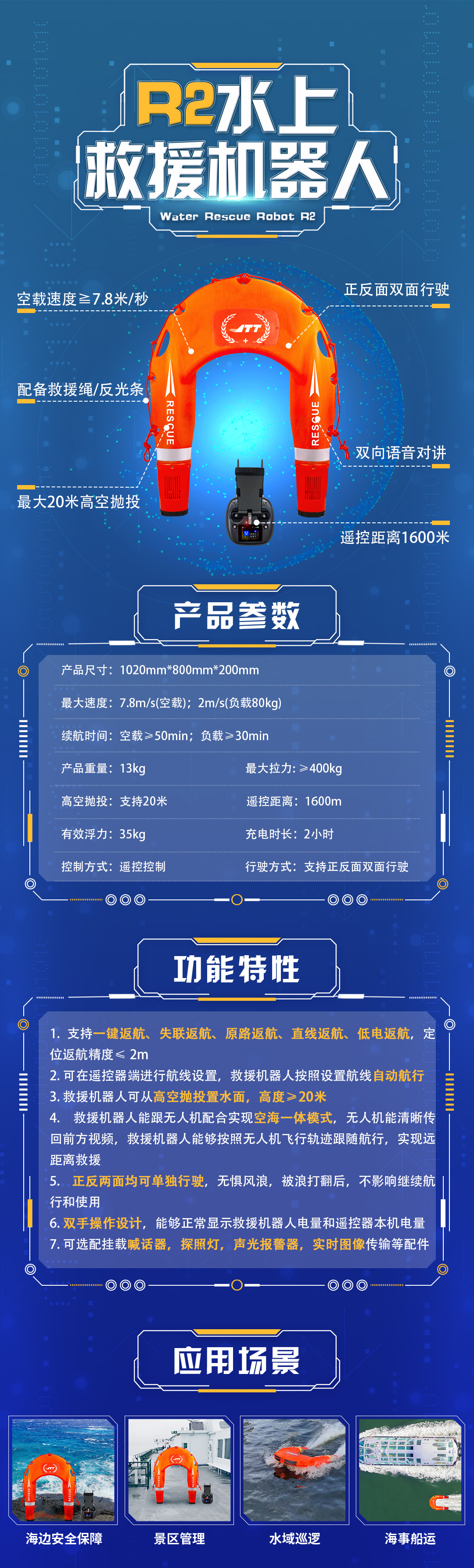 無人化水域救援可以應用到多個行業(yè)里,比如,旅游業(yè)的景區(qū)管理、海邊安全保障、水域巡邏,運輸業(yè)的海事船運,消防行業(yè)的抗洪救災,潛水打撈行業(yè)的水下搜尋及打撈、船體檢測等。當中可應用到上述場景的裝備有水上救援機器人、水上救援艇以及水下機器人。R1/R2水上救援機器人專注于水域環(huán)境中1-3人的緊急救援、水域巡邏,在日常的巡邏工作中,如果發(fā)現(xiàn)不慎落水者,救援隊可以隨時拋投R1/R2出發(fā),遙控操控,并以最快7.8m/s的速度,抵達落水者身邊;T1水上救援艇專注于4-6人大規(guī)模的水域救援,入水自動充氣識別,可以搭載對講、喊話、照明設備,遙控操控,在洪災救援、內河、輪渡等場景運作高效;P1水下機器人專注于水下的搜尋、拍攝、打撈、檢查,具備鋁合金緊湊型機身,可以避免蛙人在寒冷天氣下的水下工作。