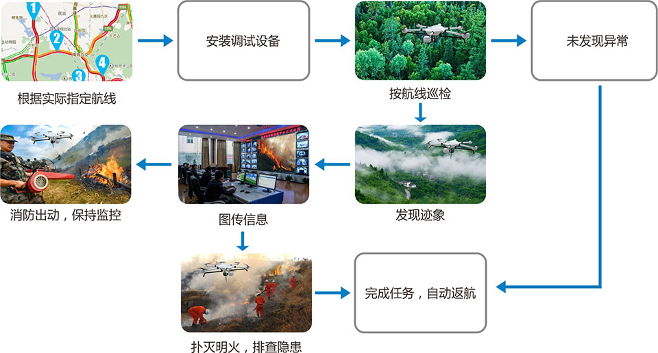 日常巡查,火場偵查,救災輔助,疏散火場周圍人員,數據回傳等。