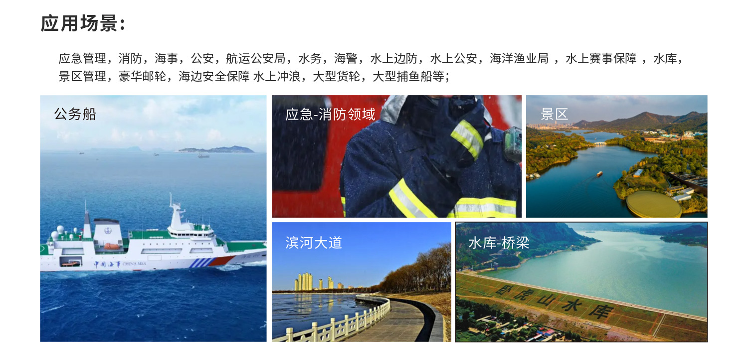 應(yīng)用領(lǐng)域: 應(yīng)急管理,消防,海事,公安,航運(yùn)公安局,水務(wù),海警,水上邊防,水上公安,海洋漁業(yè)局 ,水上賽事保障 ,水庫,景區(qū)管理,豪華郵輪,海邊安全保障 水上沖浪,大型貨輪,大型捕魚船等。